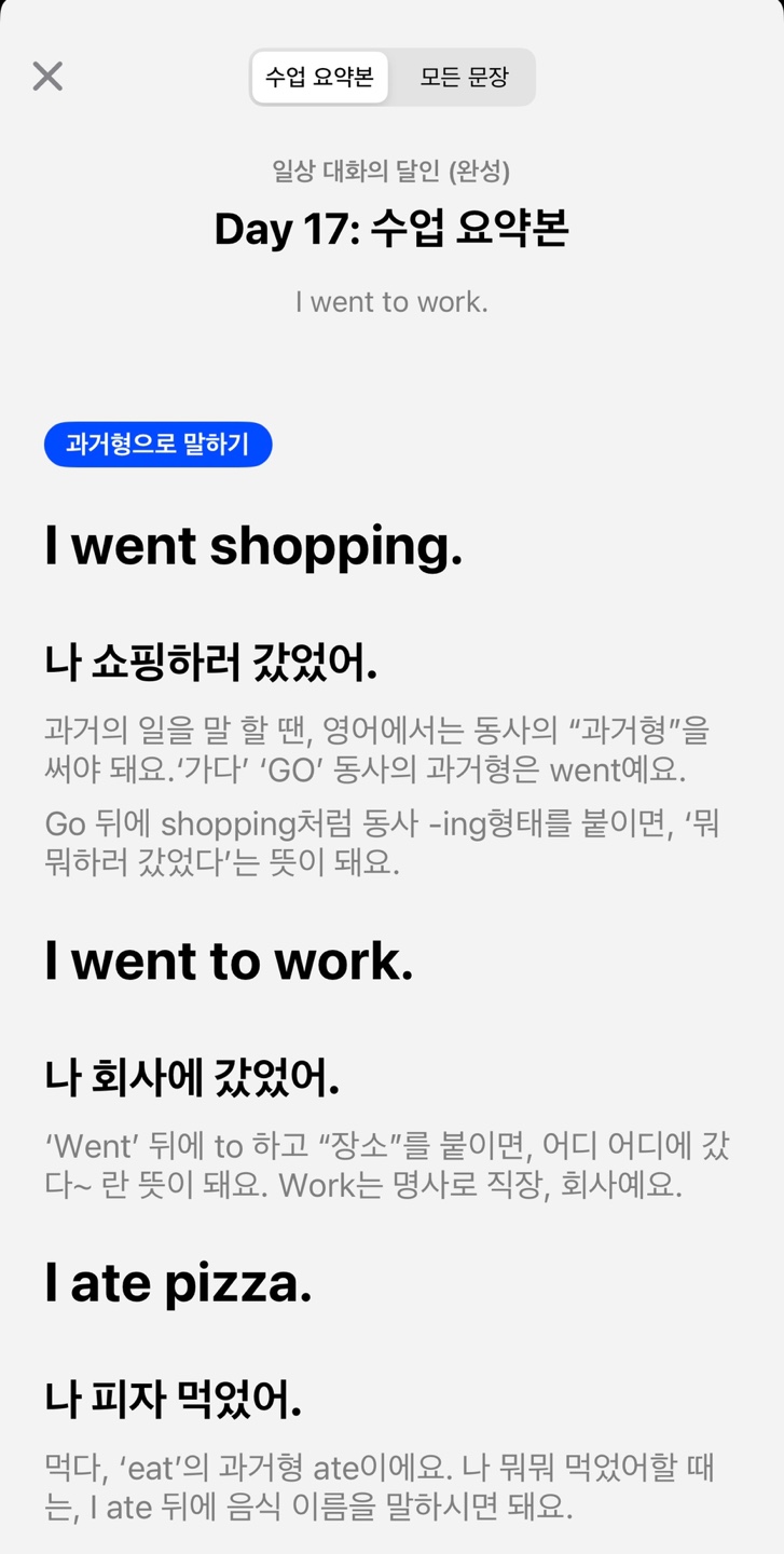 그날 배운 수업 내용이 보고 싶다면 수업 시작 전 화면 우측 상단에 있는 노트를 꾹 눌러주세요. 그러면 수업요약본과 그날 배운 모든 문장이 잘 정리되어 있습니다. 비즈니스 과정까지 다 마치고 연습하는 겸 일상 대화의 달인을 우연히 클릭했다가 생생한 네이티브 스피커의 표현을 배울 수 있는 좋은 기회여서 저는 적극 추천드립니다.