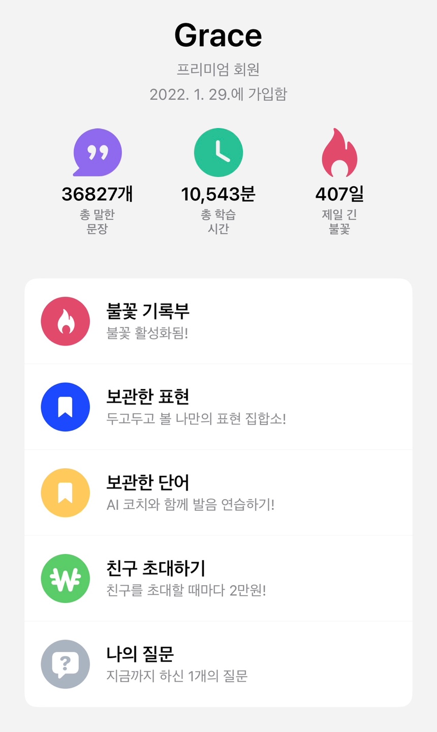 안녕하세요? 스픽으로 영어공부하는 그레이스입니다. 2022년 1월 29일 스픽을 만난 이래로 중간에 하루 빼고 꾸준히 공부하고 있습니다. 2022년 5월 12일 숙취만 아니었다면 기록을 이어갈 수 있었던 아쉬움이 남습니다.