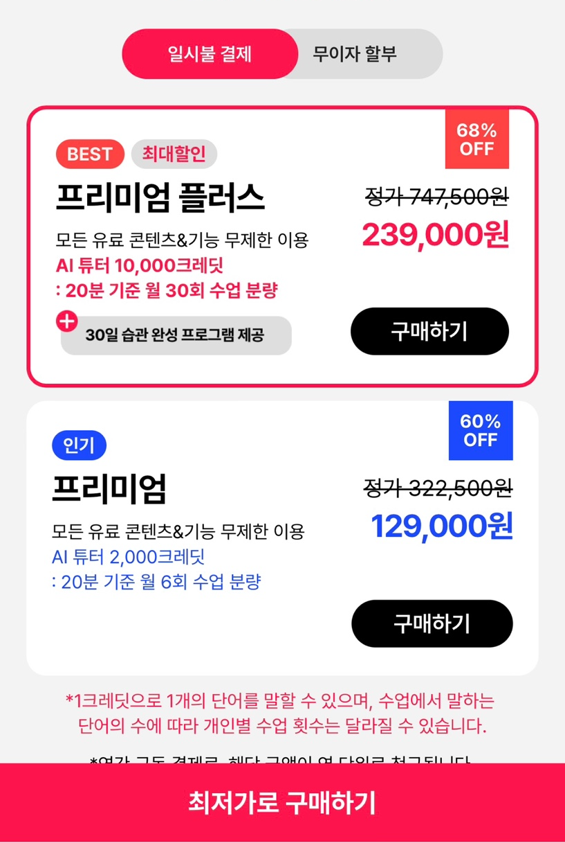 스픽 구독권 종류는 크게 두 가지로 나눠지는데요. AI 튜터와 충분히 대화할 수 있는 프리미엄 플러스 1년 구독권이 239,000원이고, 일반 프리미엄이 129,000원입니다. 프리미엄 플러스의 경우 24만원에 달하기 때문에 한번에 결제하기에는 약간 부담이 가는 금액입니다.