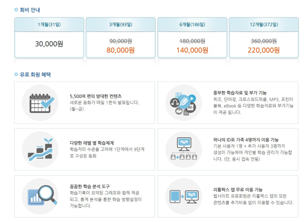 리틀팍스의 비용은 1개월이 3만원, 3개월이 8만 원, 6개월이 14만 원, 12개월이 22만 원으로 되어 있습니다. 장기간 구매에 대한 혜택이 주어집니다. 이번 이벤트에는 12개월짜리 회원권을 176,000원에 구매할 수 있는 기회가 주어집니다. 6개월짜리 회원권보다 조금 더 비싼 가격으로 1년치 회원혜택을 누릴 수 있는 이번 이벤트는 가성비 좋은 기회임이 틀림없습니다.