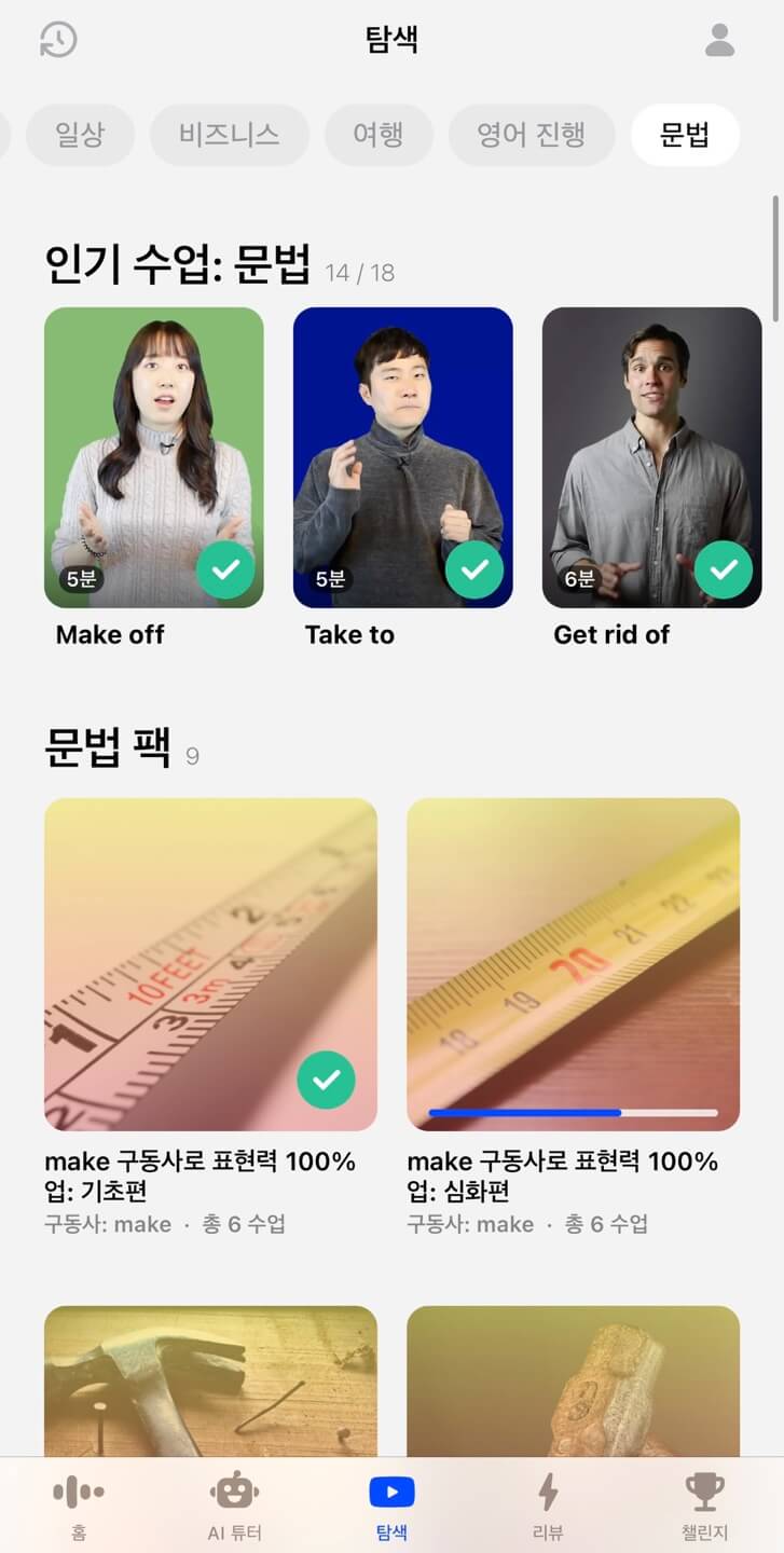 수준에 따라 코스를 고릅니다. 왕초보부터 기초, 중급, 고급, 여행영어, 구동사 격파 등 다양한 코스가 준비되어 있습니다. 업데이트를 안 하는 타 앱과는 달리 스픽은 꾸준하게 업데이트를 통해 코스를 점점 늘리고 있습니다. 수업을 한 가지 선택하셔서 1일 차를 완료해 보세요. 시간은 대략 10분 내외로, 생각보다 오랜 시간을 할애하지 않아도 됩니다.