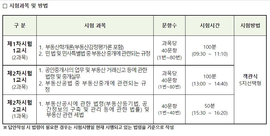 2차 과목 중에 난이도가 제일 높은 과목은 공법인데, 시험 때에 정말 생소한 문제들이 쏟아져 나오기 때문에 제일 꼼꼼하게 공부를 해야 할 과목입니다. 중개사법은 공법 점수를 커버하기 위해 고득점이 필수인 과목입니다. 공시세법은 두 과목이 한 시험으로 되어 있지만 결코 포기하면 안되는 과목입니다. 보통 공시법에 힘을 주어 공부를 하지만, 세법은 실무상 필요한 부분이 많기 때문에 절대로 포기하지 마시라는 말씀을 드립니다.