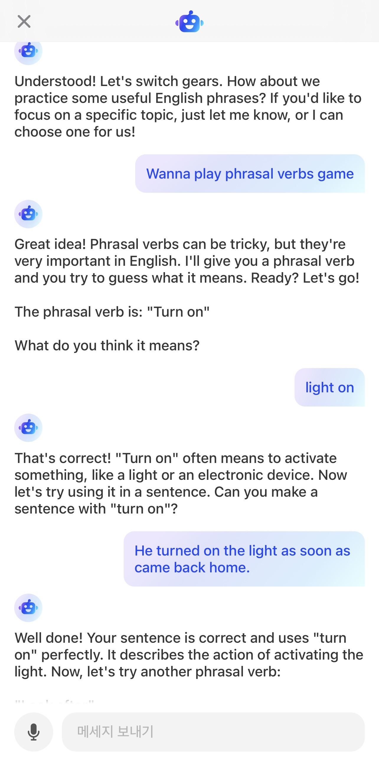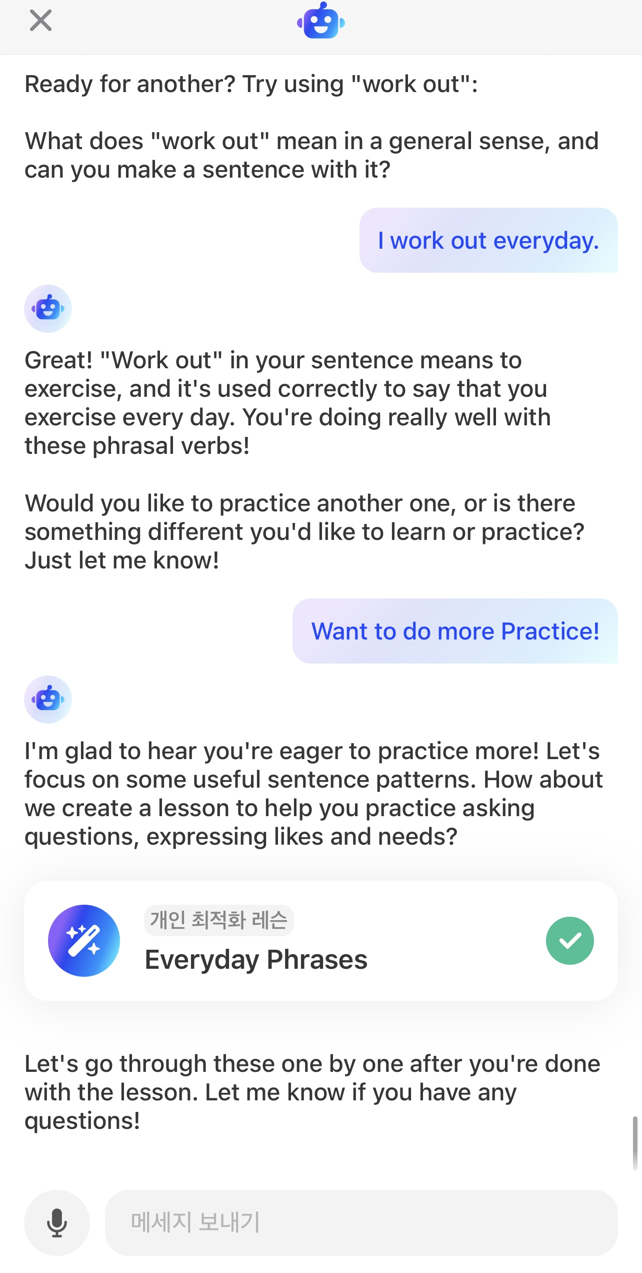 이어 동사 게임을 하고 싶다고 하니 문제를 주고 문장을 만들라고 합니다. 틀리면 올바른 뜻도 제시해 줍니다. 또한 맞춤 레슨도 알아서 만들어준답니다. 이 모든 기능이 연간 129,000원에 불과하답니다. 링크를 통해 가입하면 2만 원 추가 할인을 받을 수 있습니다.
