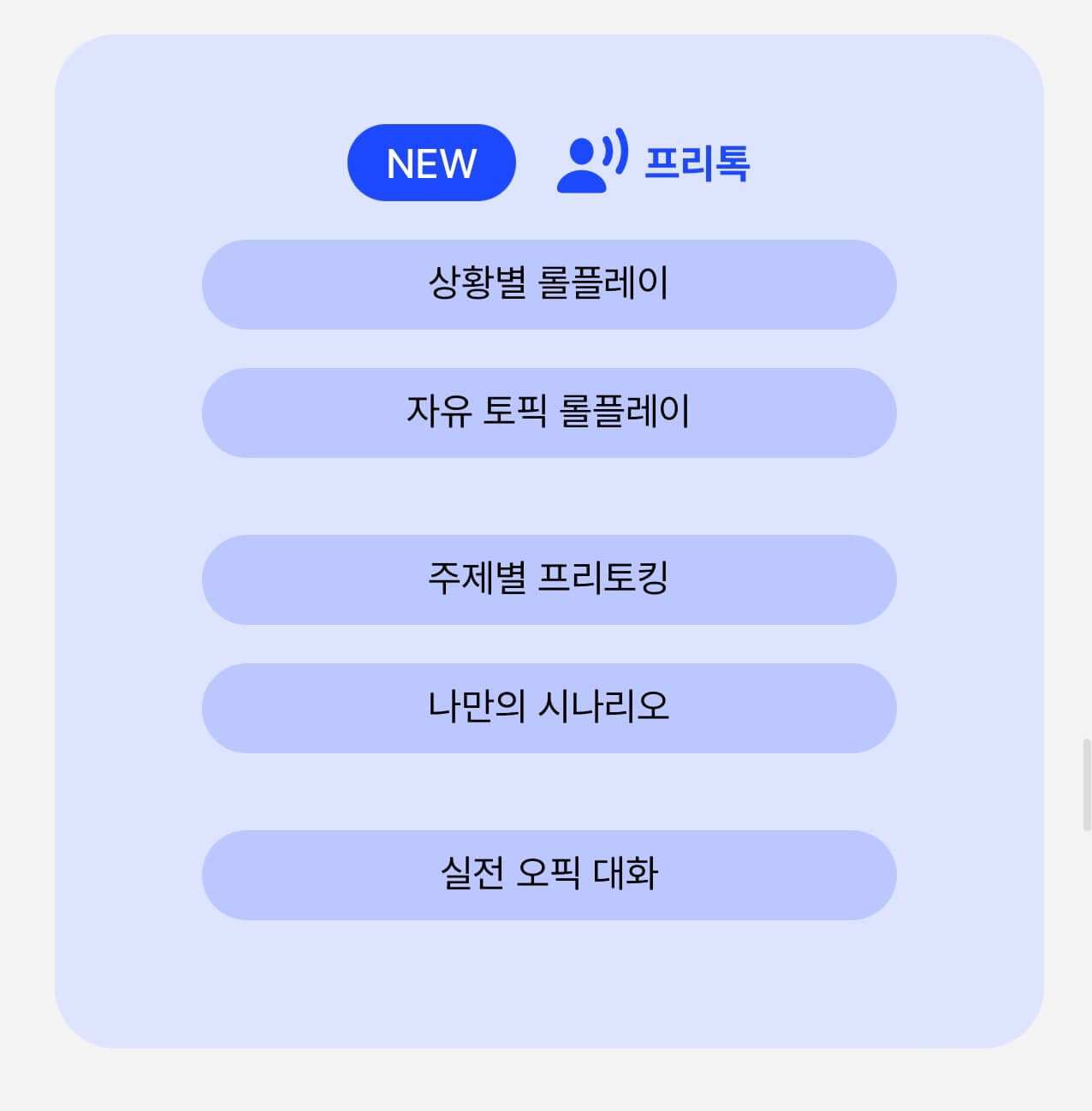 이것만으로 부족하시다고요? 걱정 마세요! 프리톡으로 오시면 AI와 신나는 대화를 이어나가실 수 있습니다. 대화를 하기 전에 필요한 필수 표현들을 미리 익히시면 보다 더 수월하게 스피킹을 하실 수 있습니다. 전혀 어려워하실 필요 없어요!