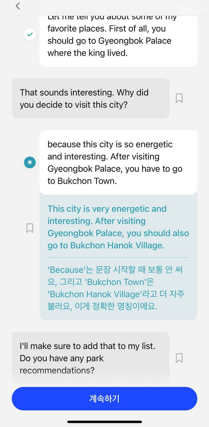 7. 대화가 끝난 후 내가 말한 문장 피드백을 받습니다. 정확한 지역 명칭도 수정해 주고 있습니다.