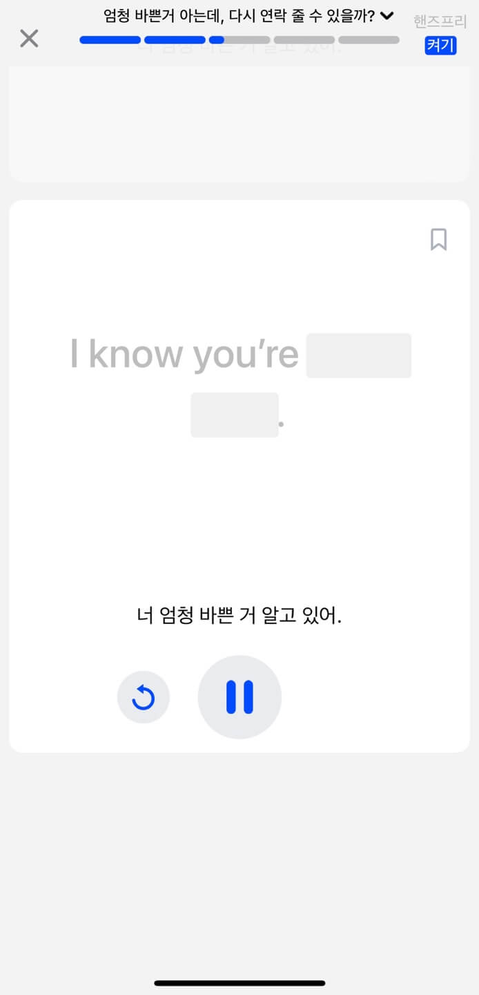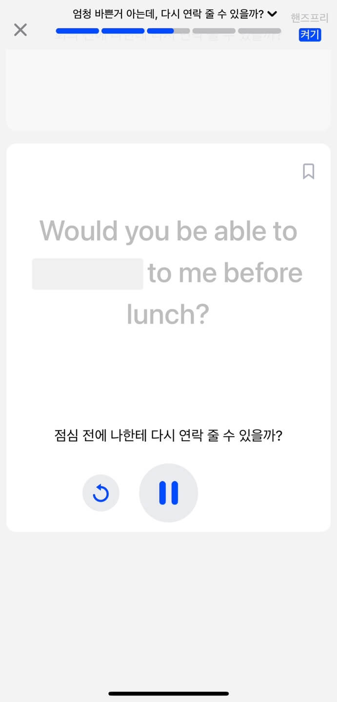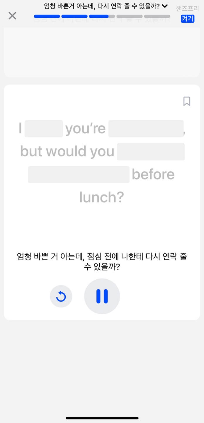 오늘 제가 공부한 내용을 예시로 들어 볼게요. 첫 번째는 통 문장을 제시해 주고 그다음에는 조금씩 표현을 가리기 시작합니다. 마지막 세 번째 문장에는 거의 다 가려서 외우지 않으면 할 수 없게 끔 만들어 버립니다.
