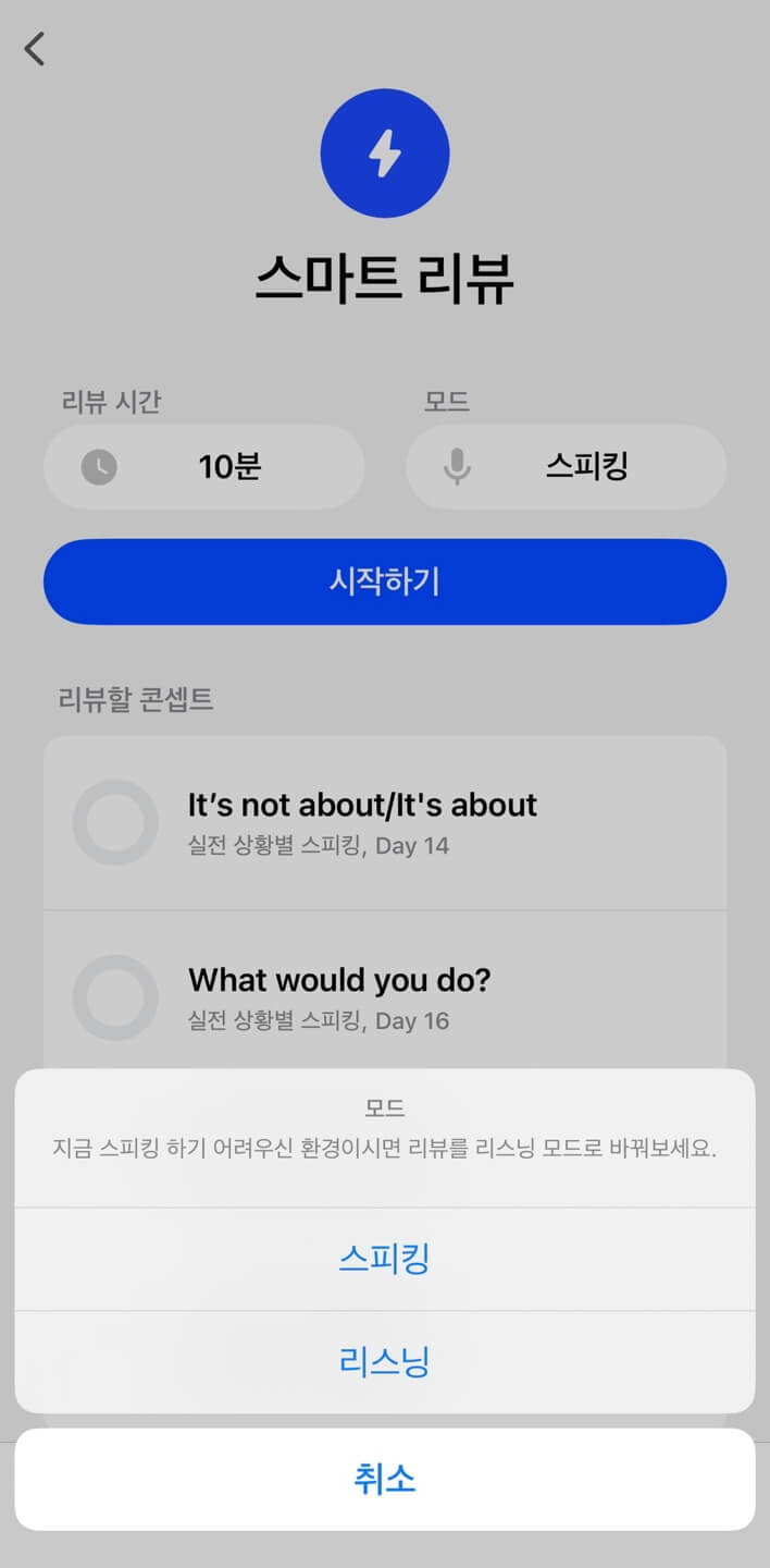 리뷰 시스템은 5분단위로 5분~20분까지 지정할 수 있습니다. 혹시라도 스피킹이 어려운 환경이라면 리스닝을 통해서 배웠던 표현을 다시 익히는 시간을 가지시는 것도 추천드립니다. 스픽이란 앱은 진짜 꼼꼼한 어플이란 걸 다시금 느끼게 된답니다.