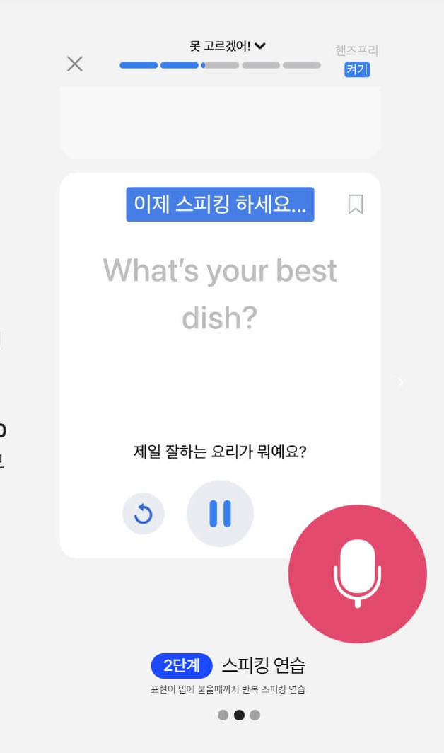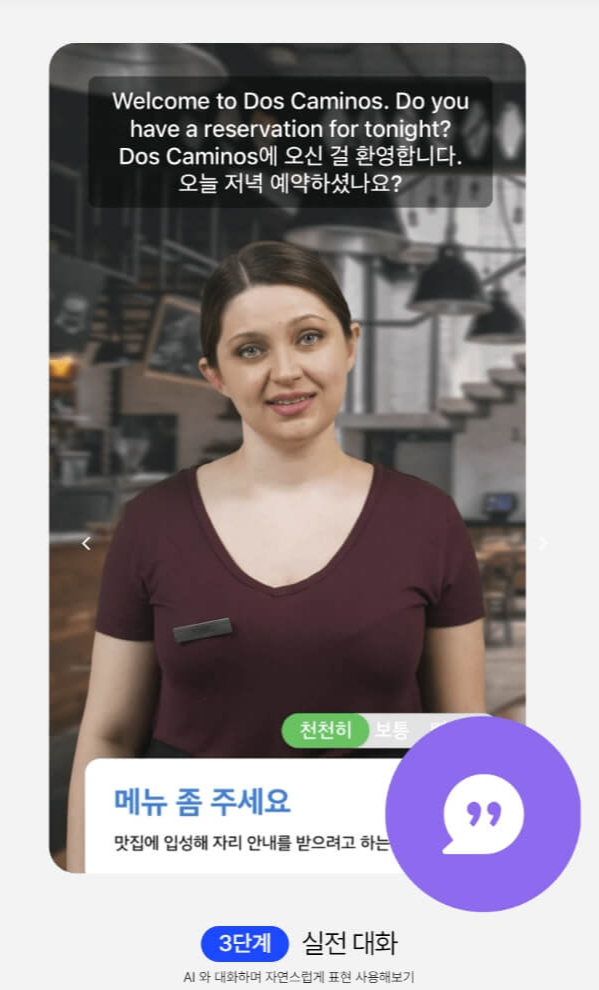 미션에 맞추어 AI와 원어민 대화를 할 수 있습니다. 내가 말한 문장이 어색하다면 스픽에서 열심히 고쳐주니까 걱정 안 하셔도 됩니다. 심지어 한국말로 말해도 영어로 번역해서 전달해 주는 전지전능한 스픽 AI의 능력은 다소 오싹하기도 합니다. 때에 따라서 주변에 다른 사람의 말이 번역돼서 나타날 수도 있으니 조용한 곳에서 수업을 진행하시기 바랍니다.
