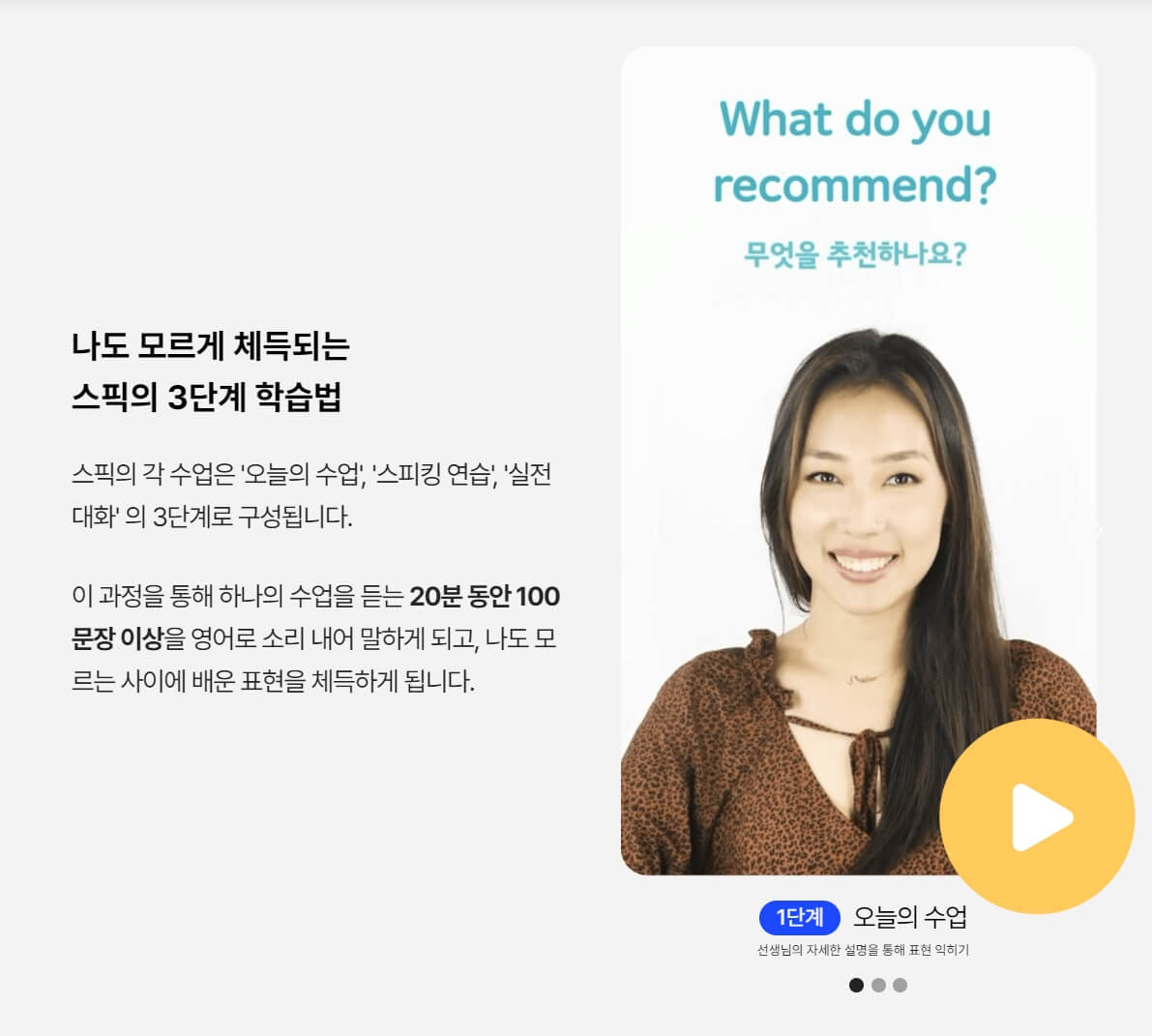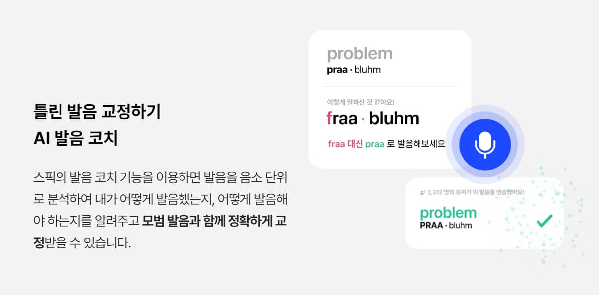 내 발음이 걱정되신다고요? 스픽으로 진단받고 교정도 가능합니다. 원어민 선생님 앞에서 쑥스러워하지 않아도 됩니다. 인공지능 AI가 당신의 발음을 고쳐주니 부끄러움은 저 하늘 위로! 이제 당당하게 발음 교정받고 영어 스피킹 하세요!