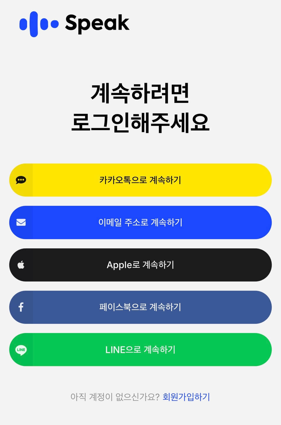 스픽에 가입하는 방법은 다음과 같습니다. 카카오톡, 이메일, Apple, 페이스북, 라인으로 총 5가지가 있습니다.
