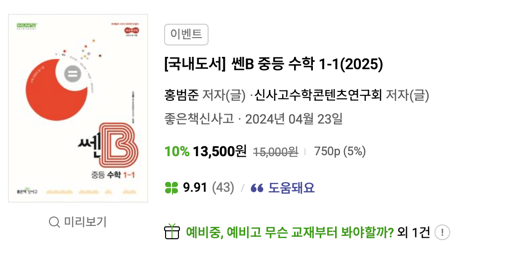 쎈 시리즈는 초등에도 널리 알려진 수학교재입니다. 이 쎈 B 중등수학은 유형서인 동시에 약간의 심화(C)를 다루고 있습니다.