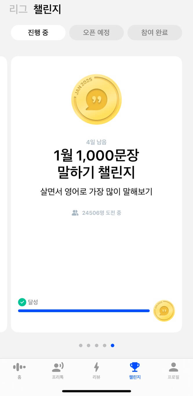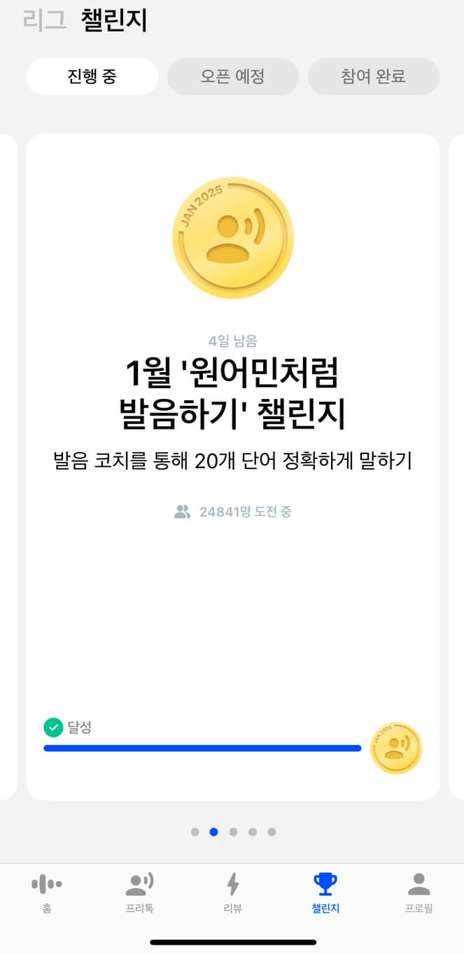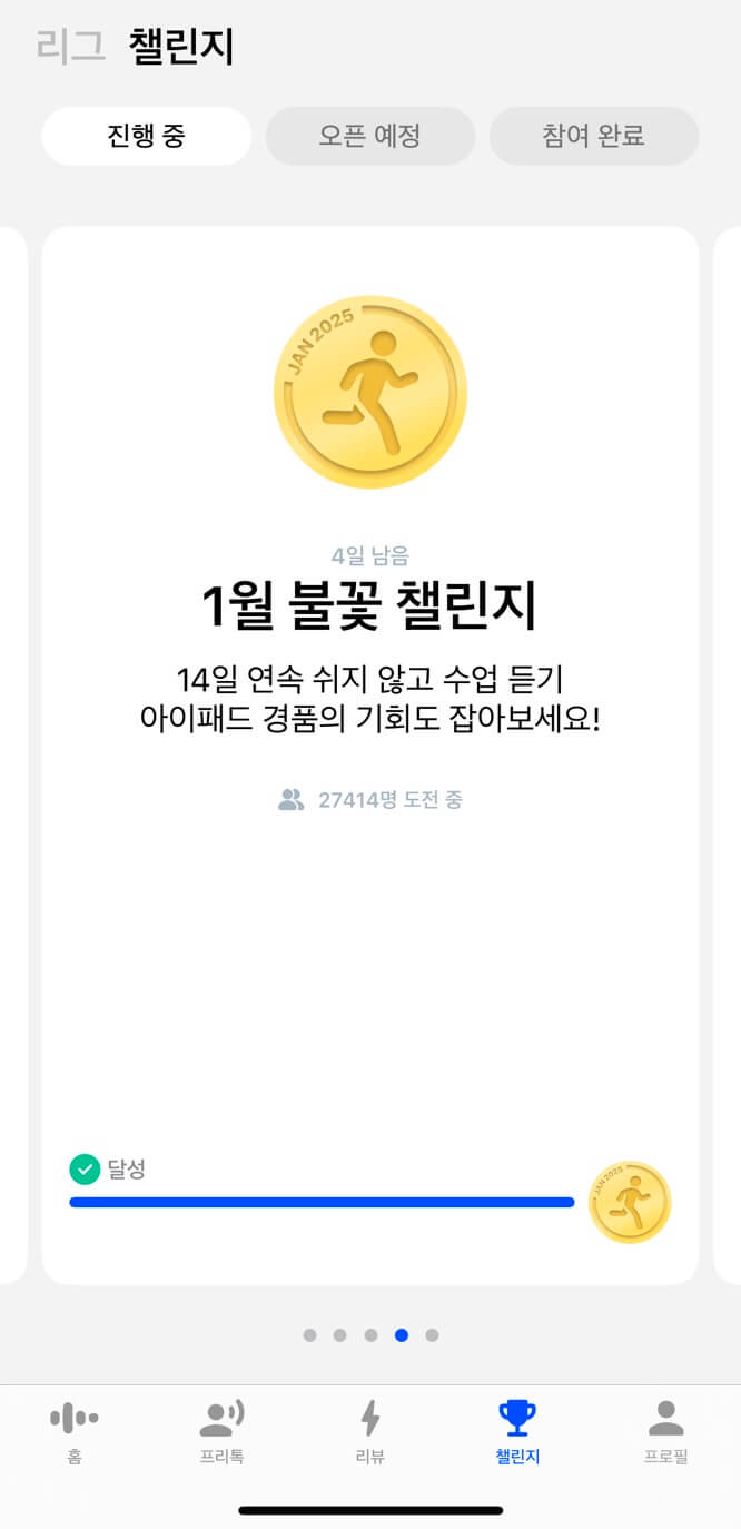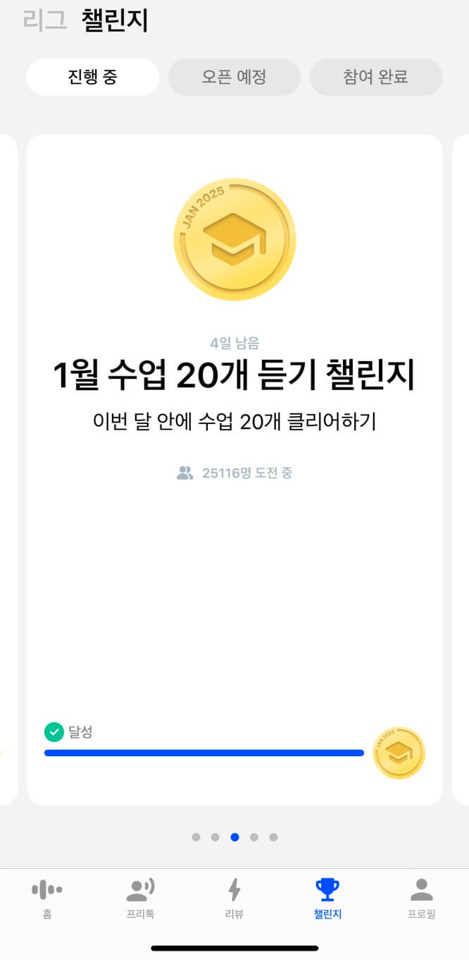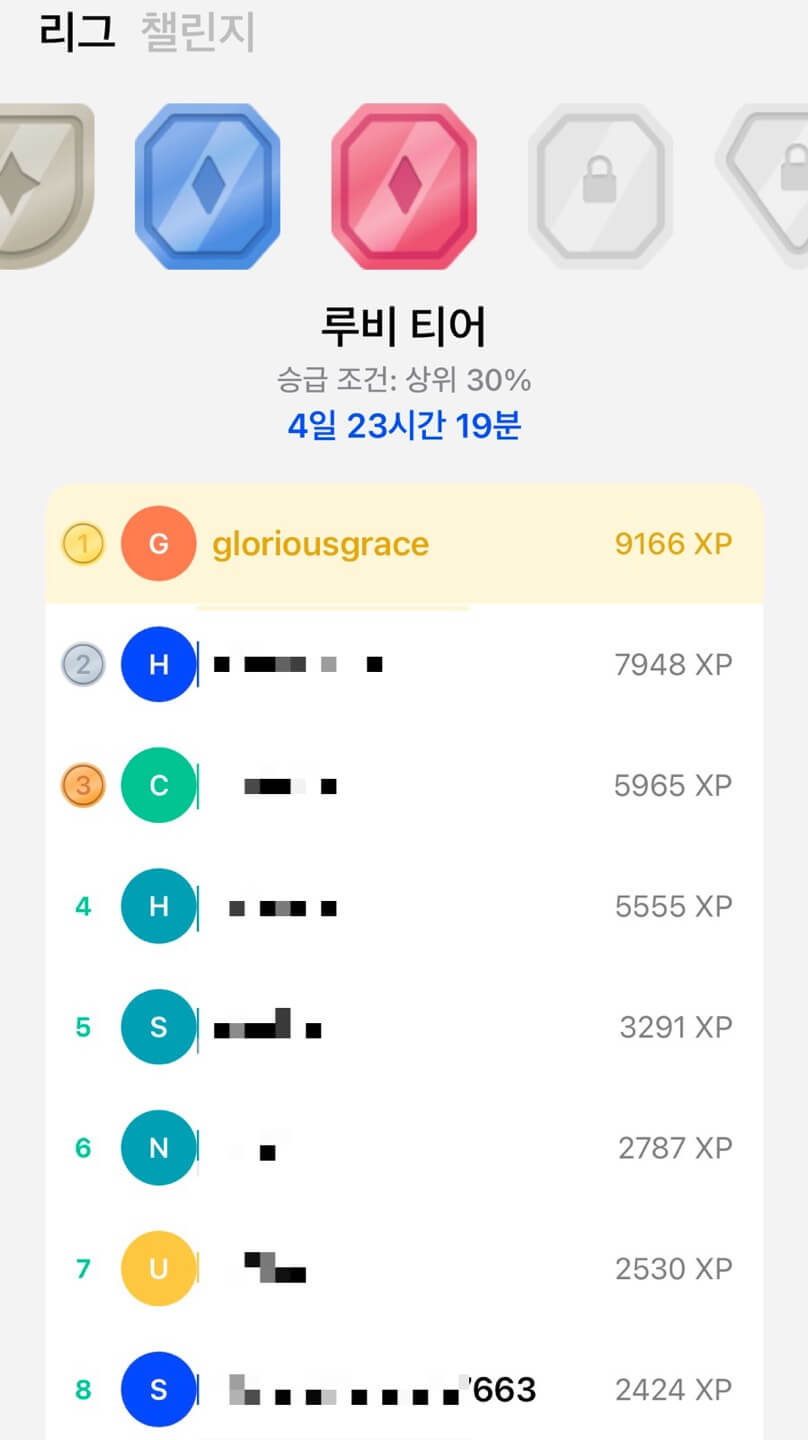 최근에 챌린지를 시작하면서 말하는 양이 많이 늘었습니다. 챌린지 덕분에 리뷰모드 100%, 모든 수업 클리어, 탐색의 모든 수업을 끝마쳤습니다. 가입하시면 꼭 리그에 가입해보세요. 저는 현재 루비 리그에 참여 중인데요. 늘 1위를 하기 위해 부단하게 노력 중입니다. 당신 안에 있는 영어에 대한 열정이 살아나게 됩니다.