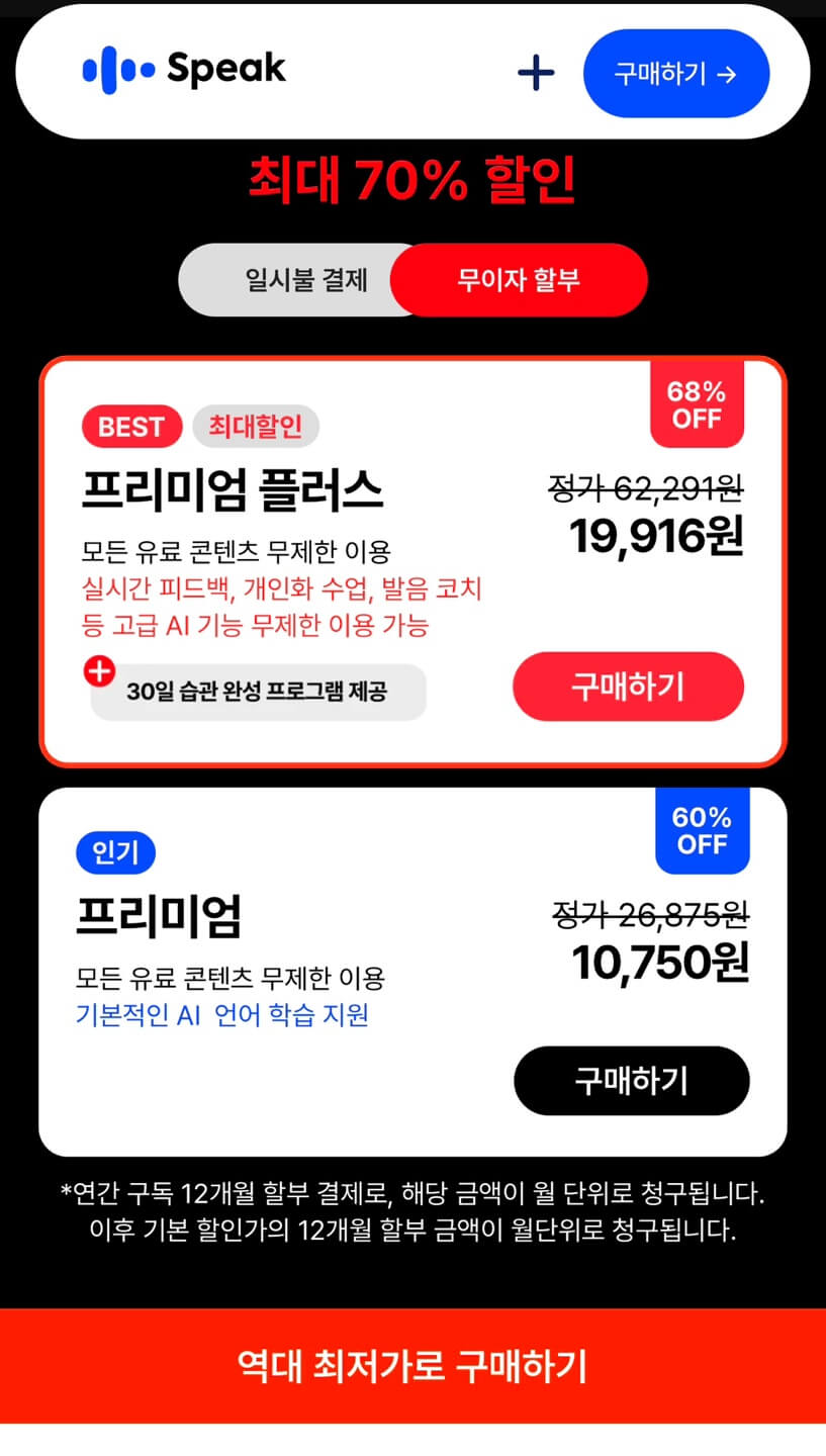 1. 스픽 프리미엄 플러스 구독권 최대 7만 원 할인