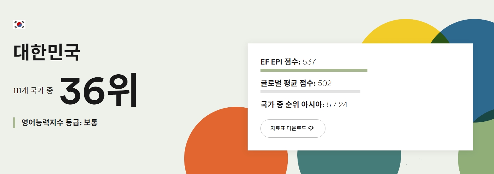 하지만, 증가하는 사교육비와는 달리 영어능력지수 국가별 랭킹은 세계 36위로 나타났습니다. 이는 전체 국가들 중에서 평균에 해당합니다. 아시아 국가 중에서는 5위입니다. 사교육비가 영어능력 향상에 크게 도움이 되는 것 같지는 않아 보입니다.