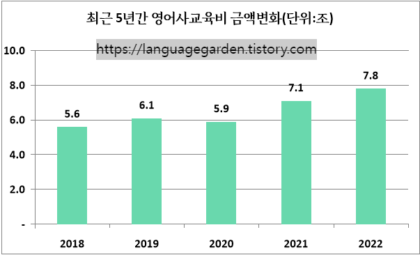 통계청 자료에 따르면, 영어에 대한 사교육비는 작년(2022년) 한 해, 무려 약 7조 8천억 원이 지출된 것으로 나타났습니다. 2020년 코로나로 인해 상승률이 잠시 주춤했던 것을 제외하면, 계속 증가하는 추세를 보여주고 있습니다.