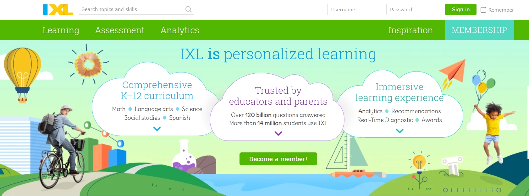 IXL is the world's most popular subscription-based learning site for K–12. Used by over 14 million students, IXL provides personalized learning in more than 9,000 topics, covering math, language arts, science, social studies, and Spanish. Interactive que
